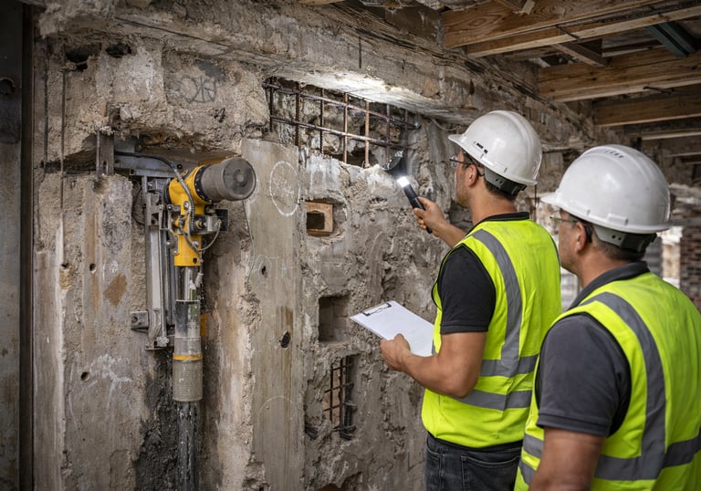 Carottages béton, sondages destructifs et ouvertures ciblées pour analyse précise des ouvrages existants.